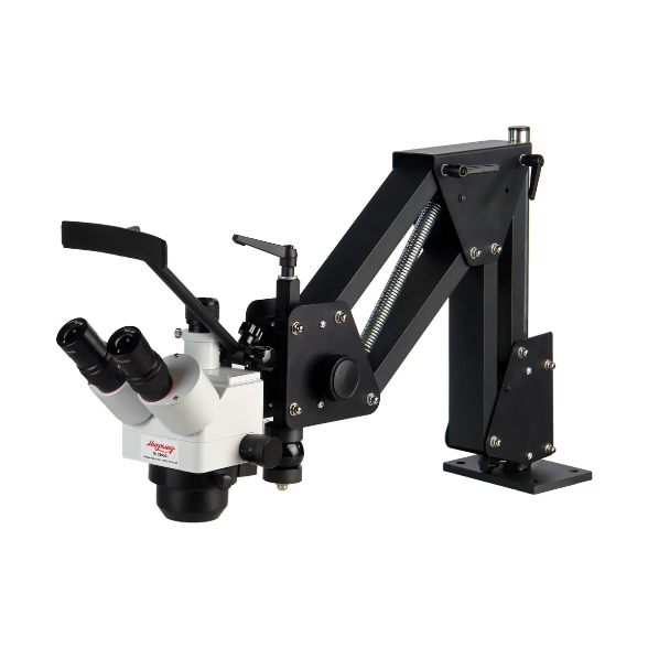 Специальный штатив микроскопа имеет 6 степеней свободы, это позволяет перемещать и наклонять оптическую головку в широких пределах. Максимальная высота штатива в поднятом состоянии 585 мм при минимальной высоте 142 мм, что достигается благодаря конструкции на рычагах. Штатив допускает вращение головки вокруг штативной штанги, наклоны и выносы в пределах от 360 - 800 мм, это позволяет размещать исследуемый образец в удобной точке рабочего пространства в том числе вне лабораторного стола. Благодаря складной рычажной конструкции, занимаемое микроскопом рабочее пространство может быть сведено к минимуму. В комплекте микроскопа Т-образный подголовник позволяющий уменьшить нагрузку на шейный отдел позвоночника при наблюдениях создавая дополнительный комфорт при длительной работе.